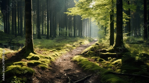 © CStock, Obraz premium enchanting forest scene with sunlight streaming through the trees, casting dappled shadows on the forest floor.