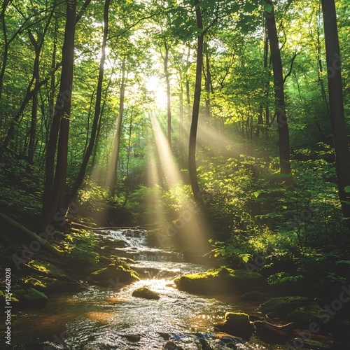 © Ketobox, Fototapeta premium Enchanting Forest Stream Bathed in Golden Sunlight Serene Nature Scene with Lush Greenery
