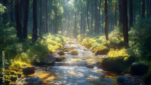 Fototapeta premium Enchanting Forest Stream with Mossy Rocks and Sunlit Foliage