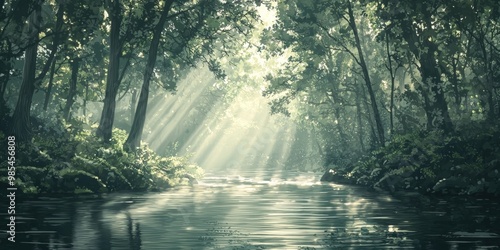 © Rudsaphon, Obraz premium Enchanting Forest Stream with Shimmering Sunlight Rays