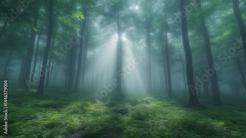 Fototapeta premium Enchanting Forest with Sunlight Beams Filtering Through the Trees Creating a...