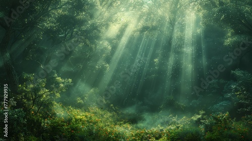 Obraz premium Enchanting forests with rays of sunlight, fairytale vibes