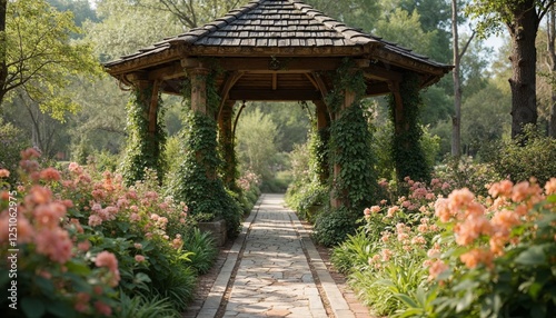 Fototapeta premium Enchanting Gazebo Retreat, A tranquil garden escape amidst blooming floral...