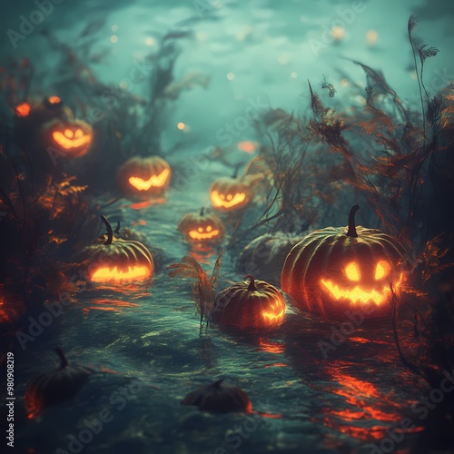 © Escapefrommm, Naklejka premium Enchanting Glow: Eerie Underwater Scene with Glowing Pumpkins Submerged