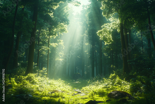 © designermetin, Obraz premium Enchanting green forest with sunbeams shining through tall trees creating a peaceful and mystical atmosphere