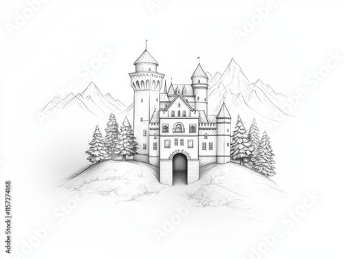 © Volodymyr Skurtul, Obraz premium Enchanting Hand-Drawn Castle Surrounded by Majestic Mountains and Trees