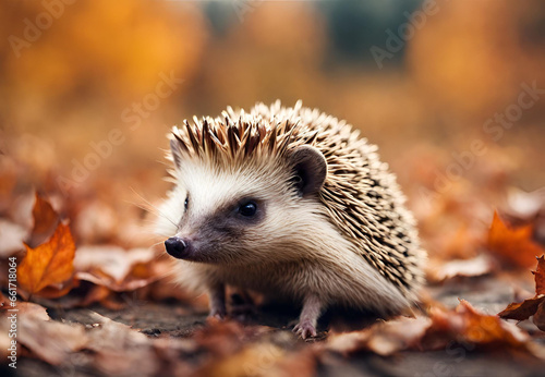 Fototapeta premium Enchanting Hedgehog in Autumn Foliage, Adorable Hedgehog Among Fall Leaves, Cute Prickly Friend in Autumnal Setting