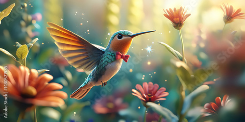 Naklejka premium Enchanting Hummingbird in a Floral Paradise Wallpaper Background for Nature...