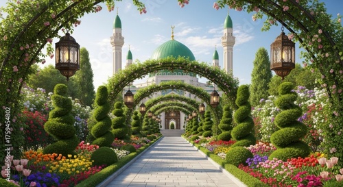 © Sejjil, Fototapeta premium Enchanting islamic garden pathway leading to a mosque with lush greenery