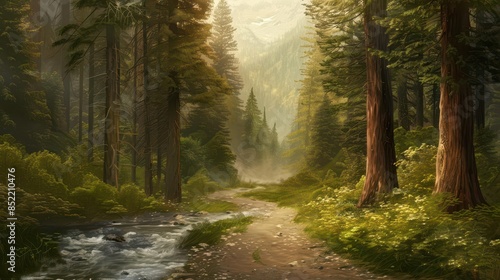 © Bijac, Fototapeta premium enchanting journey along a scenic forest road winding through ancient towering trees and cascading streams inviting exploration and wonder digital painting