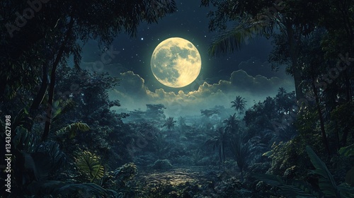 Fototapeta premium Enchanting Jungle Panorama with Full Moon in Night Sky
