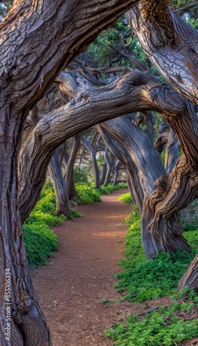 Naklejka premium Enchanting jungle trail discovering adventure through towering trees and lush vines