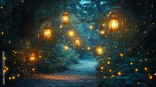 Obraz premium Enchanting lantern pathway mystical forest night scene magical atmosphere...