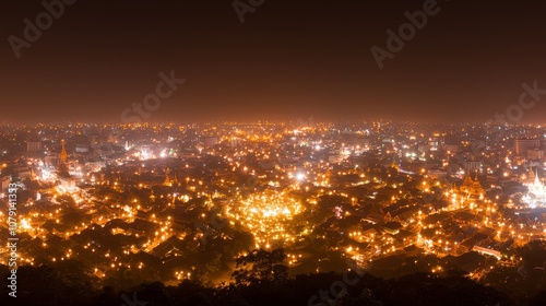 Naklejka premium Enchanting Loy Krathong Celebration with Lanterns Illuminating Night Sky Over Ancient Temples - Ultra-Detailed Panoramic View