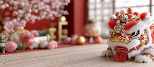 Fototapeta premium Enchanting 2025 Lunar New Year Celebration. Cute Chinese dragon, poster. traditional lion dance head poster for Chinese new year.