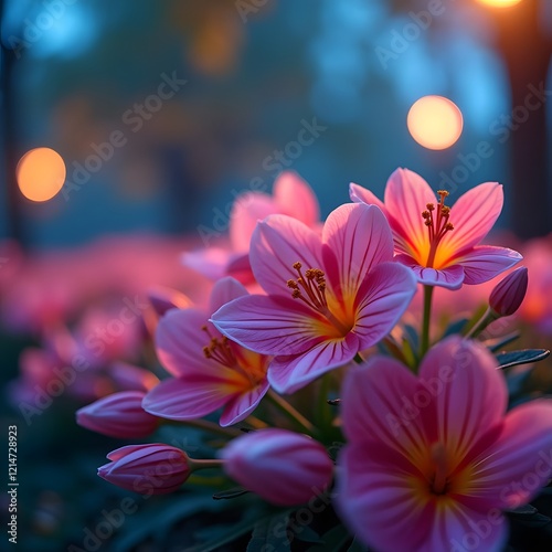 © Valerii, Fototapeta premium Enchanting Macro Flora Vibrant Park Blooms in Fluorescent Light