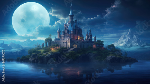 © Fang, Fototapeta premium Enchanting magical fantasy fairytale castle on the island against the backdrop of a huge moon, generative ai