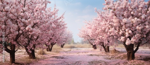 © Ilgun, Obraz premium Enchanting Meadow Blanketed with Blooming Pink Flowers and Bees Buzzing Around