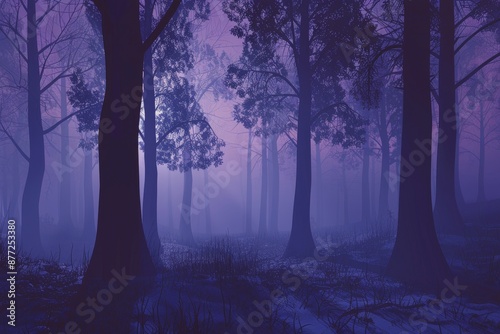 © Rattana, Naklejka premium Enchanting Misty Forest in Complementary Color Scheme - Front View 3D Render with Mystical Theme and Flat Design