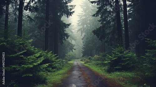 Fototapeta premium Enchanting misty forest landscape featuring lush greenery and a serene,...
