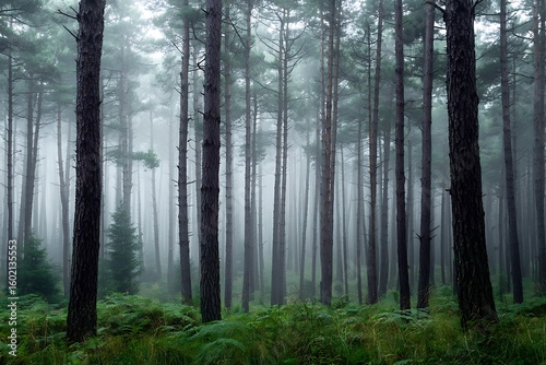© Mustafa, Naklejka premium Enchanting misty forest landscape with towering pine trees and lush green ferns for nature lovers and outdoor adventures seekers alike