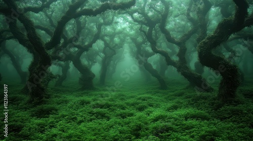 Fototapeta premium Enchanting, misty forest path with moss-covered trees.