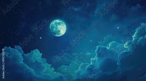 Fototapeta premium Enchanting moon in a deep blue starry sky with drifting clouds at night Scene evokes a festive vibe with a stunning cloudscape