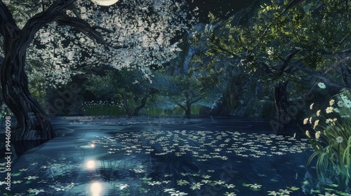 Naklejka premium Enchanting Moonlit Forest Lake.