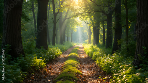 © TShirt Empire, Fototapeta premium Enchanting Morning Sunlit Forest Path Green Trees Brown Leaves Woods