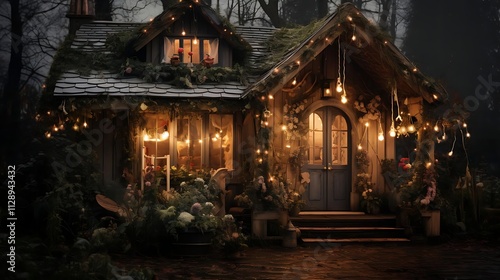 © Desain, Obraz premium Enchanting, moss-covered cottage illuminated with fairy lights at night.