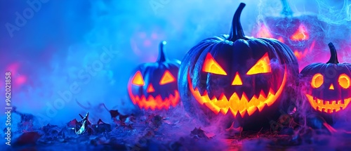 Fototapeta premium Enchanting Neon Lit Pumpkins Conjure Halloween Spirits in Mysterious...