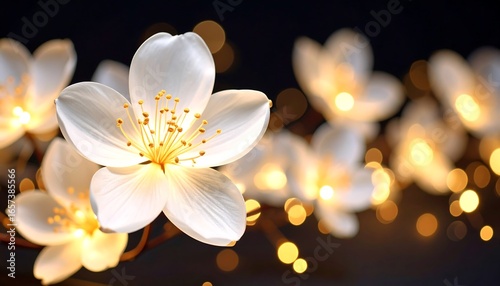 Fototapeta premium Enchanting night bloom luminous white petals with golden bokeh background creating magic