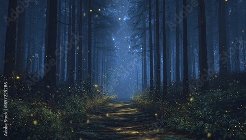 © Andi, Naklejka premium Enchanting night forest path illuminated by fireflies (4)
