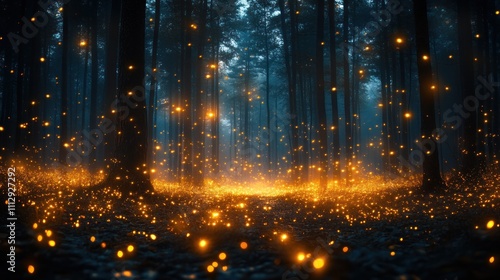 © mochalfin, Naklejka premium Enchanting night forest scene with glowing fireflies and fog.