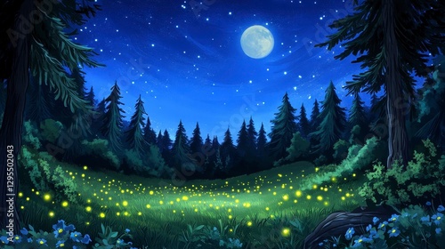 Naklejka premium Enchanting Night Landscape with Moon and Glowing Fireflies