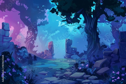 Naklejka premium Enchanting night scene with ancient stone ruins marking the entrance to a...