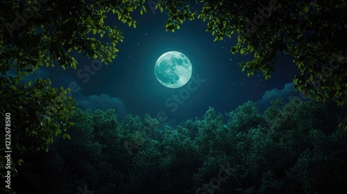 © Panupong, Fototapeta premium Enchanting Night Sky with Full Moon Surrounded by Lush Trees