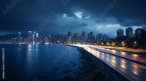 Obraz premium Enchanting Nightscapes: Illuminated Coastal Cityscape in Mesmerizing Long...