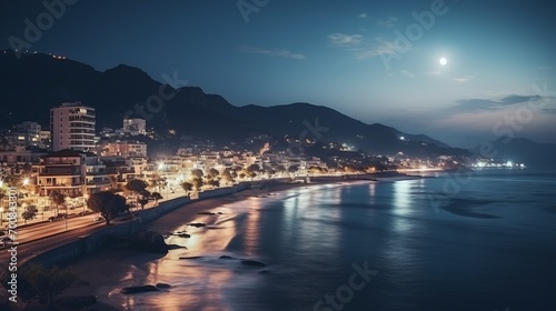 Obraz premium Enchanting Nightscapes: Illuminated Coastal Cityscape in Mesmerizing Long...