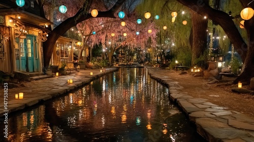 Fototapeta premium Enchanting nighttime village scene with lanterns reflections on water cozy...