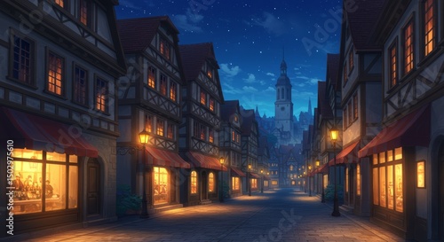 Fototapeta premium Enchanting Nighttime Vista of an Old European Town with Starry Sky and Glowing Lanterns