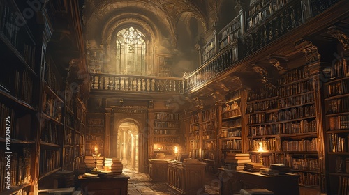 © Kitta Studio, Obraz premium Enchanting Old Library with Bookshelves and Natural Lighting