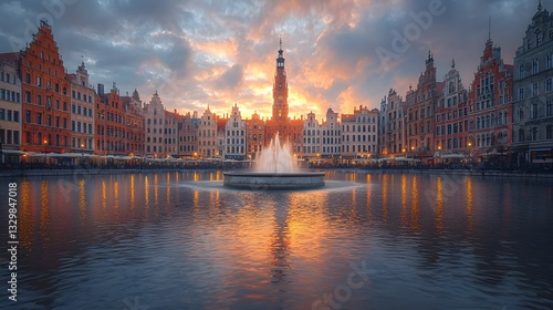 © Bussakon, Naklejka premium Enchanting Old Town Square Illuminated by Moonlight with Sparkling Fountain Reflections
