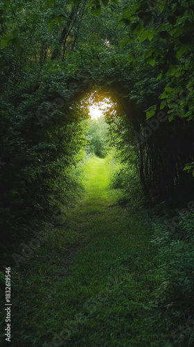 Obraz premium Enchanting path through dense forest tunnel. Sunlight illuminates the vibrant...