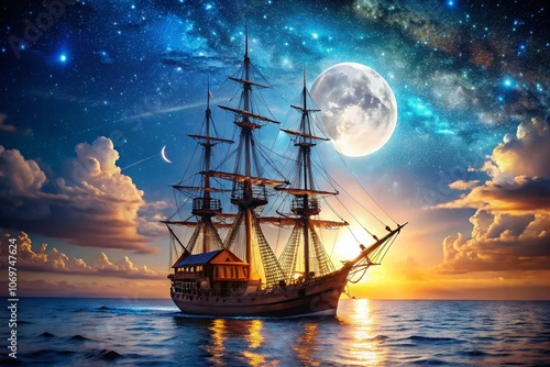 © Arnada, Fototapeta premium Enchanting Pirate Ship Sailing Under the Moonlight on a Starry Ocean Night – A Captivating Macro Photography Perspective