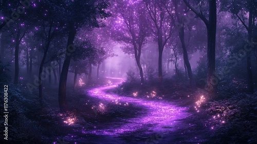 Fototapeta premium Enchanting purple forest path with glowing lights and fog.