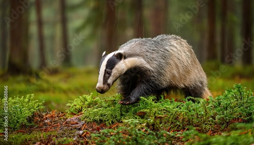 Naklejka premium Enchanting Rainy Day in a German Forest Badger Basks in a Cozy Den Amidst...