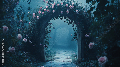 Fototapeta premium Enchanting Rose-Covered Garden Archway in Soft Pastel Tones