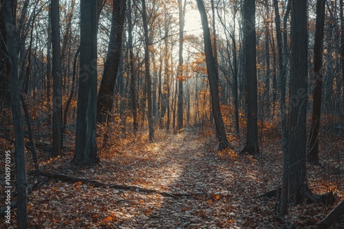 © Nakorn, Fototapeta premium Enchanting rustic autumn forest scene with fallen leaves and towering trees in golden light