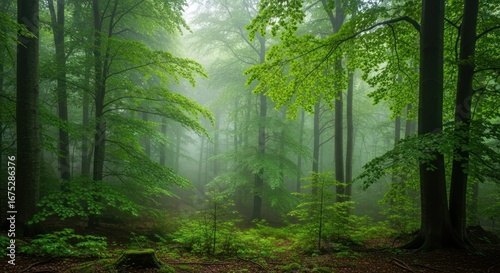 © Anak, Fototapeta premium Enchanting Spring Mist: Deep Forest Path, Vibrant Green Canopy, Soft Light